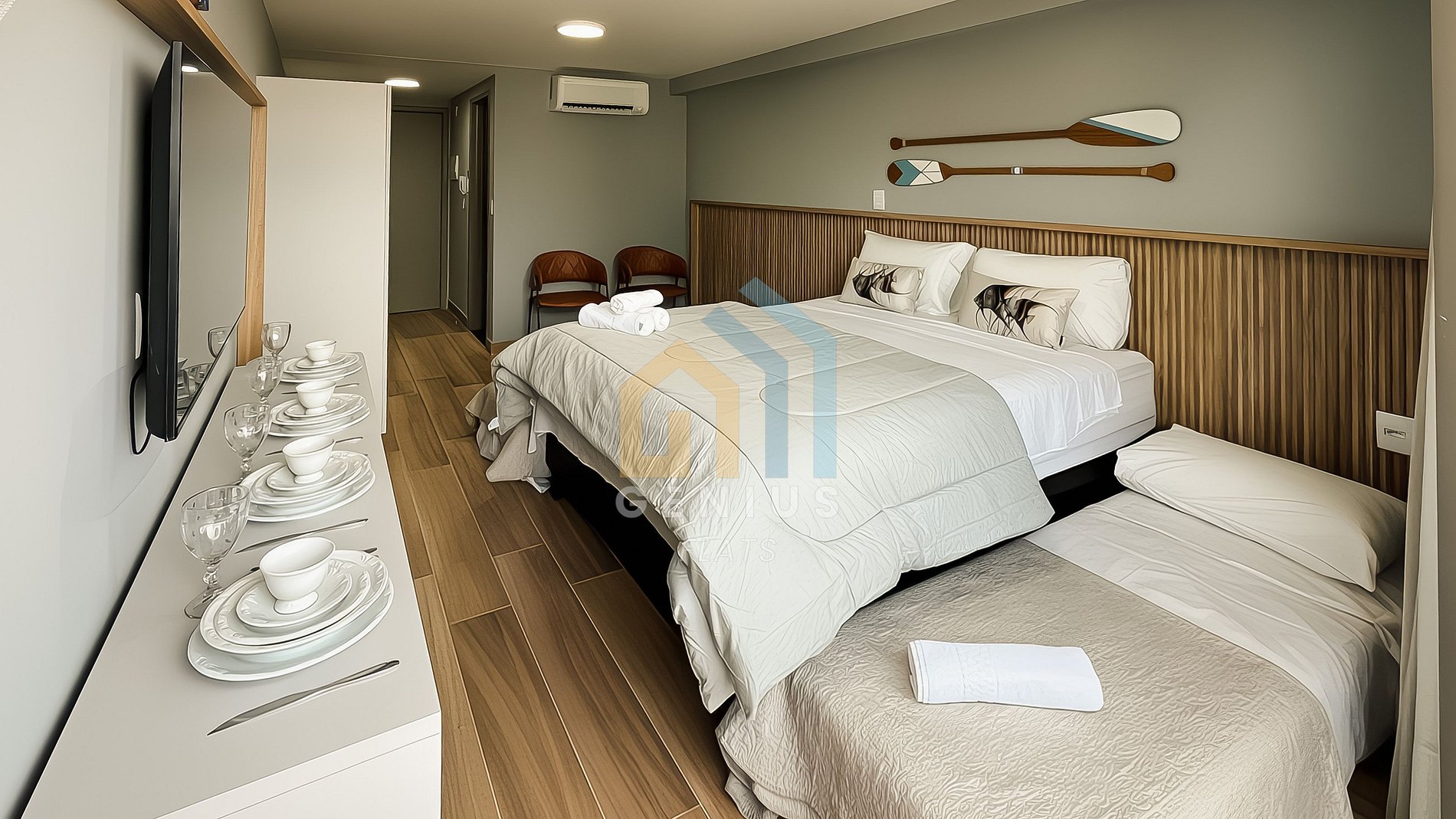 - Acomoda até 4 pessoas: 1 cama de casal e 2 camas de solteiro auxiliares.