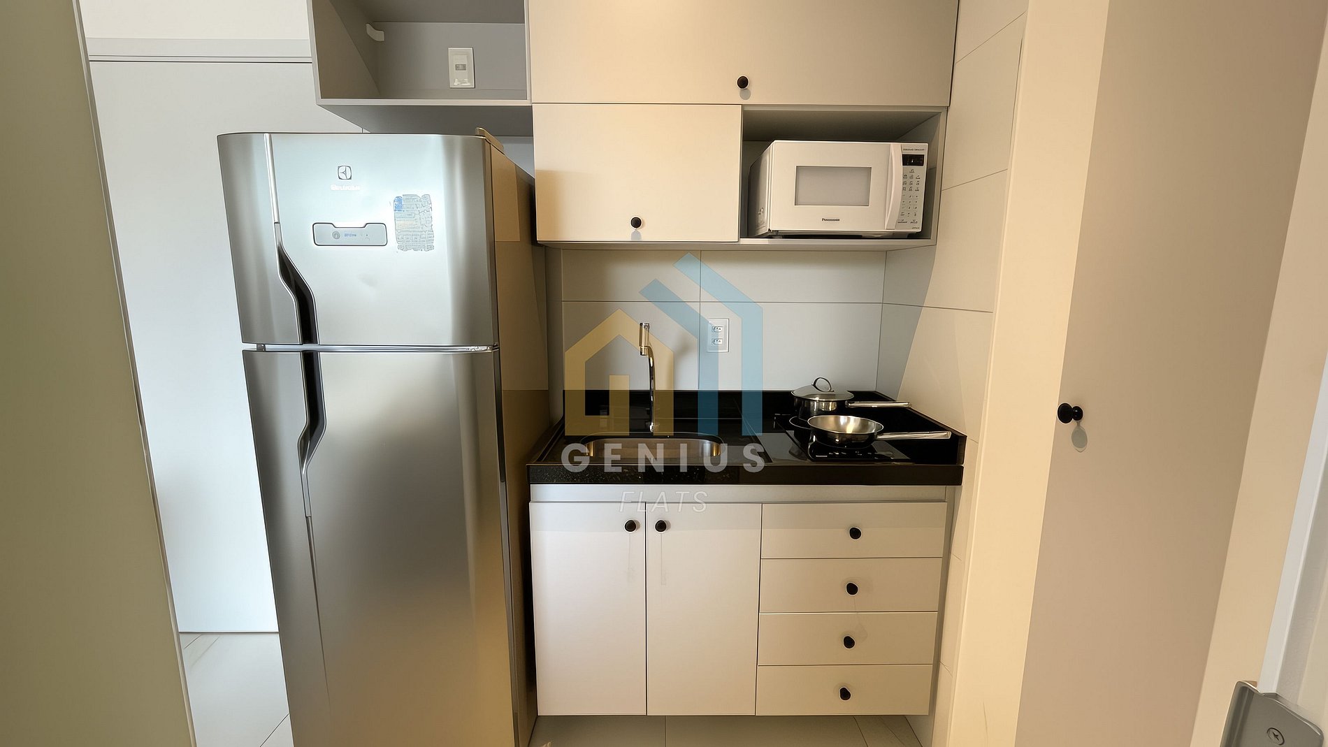 - Cozinha completamente equipada, contendo, entre outros, sanduicheira, liquidificador. Você também terá uma geladeira com freezer, fogão elétrico indução e um micro-ondas para sua total comodidade.