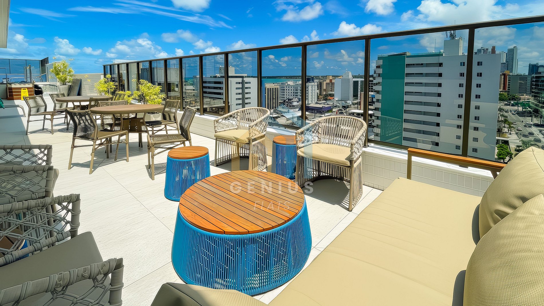 Rooftop: Área de lazer na cobertura com vista panorâmica para o mar e a cidade.