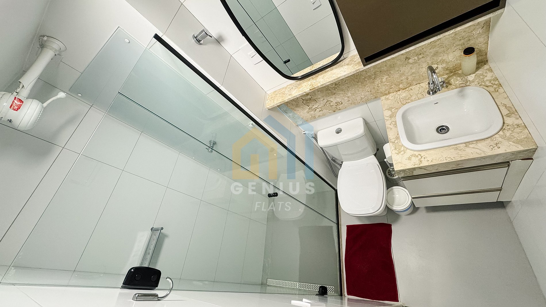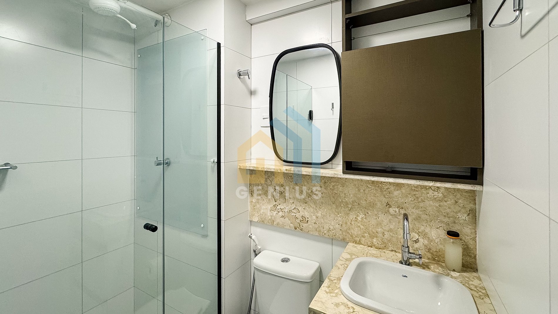 Apartamento no Cabo Branco com 2 quartos (1 suíte), 2 banheiros e varanda lateral. Quartos com ar condicionado, sala com Smart TV e ventilador, cozinha completa equipada e condomínio com piscina na cobertura, academia, cinema, jogos, minimercado, lavanderia, vaga de garagem e recepção 24h.