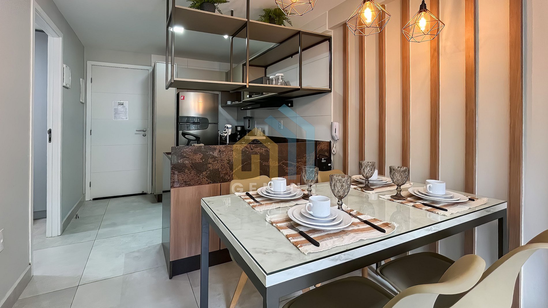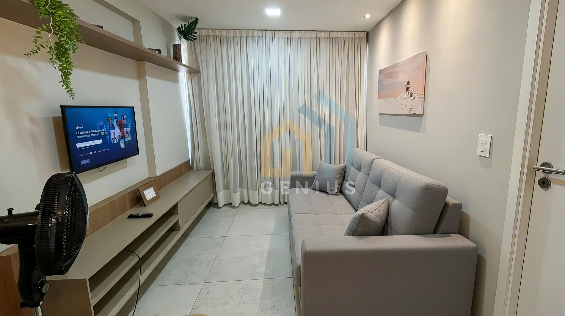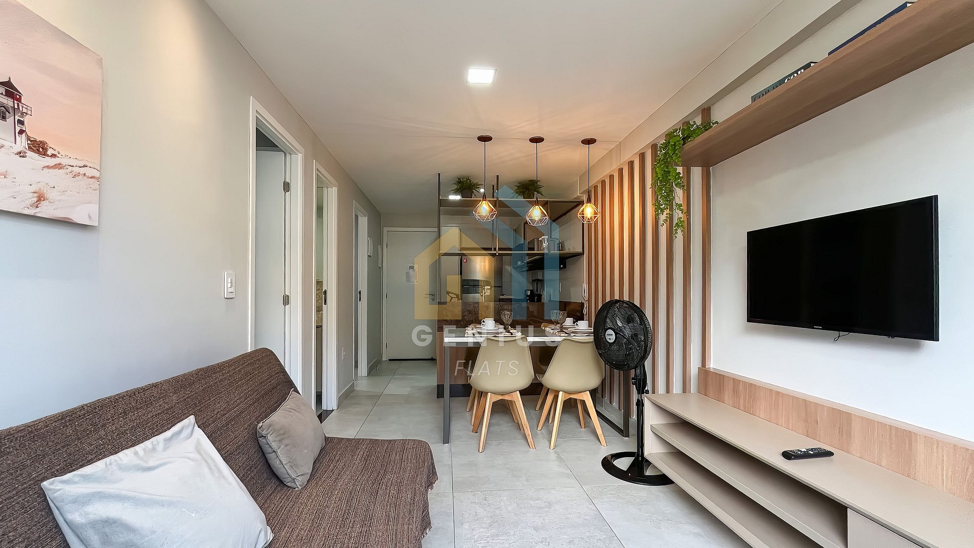 Apartamento no Cabo Branco com 2 quartos e 1 banheiro. Quartos climatizados, sala integrada com Smart TV, cozinha completa equipada e condomínio com piscina na cobertura, academia, cinema, jogos, minimercado, lavanderia, vaga de garagem e recepção 24h.