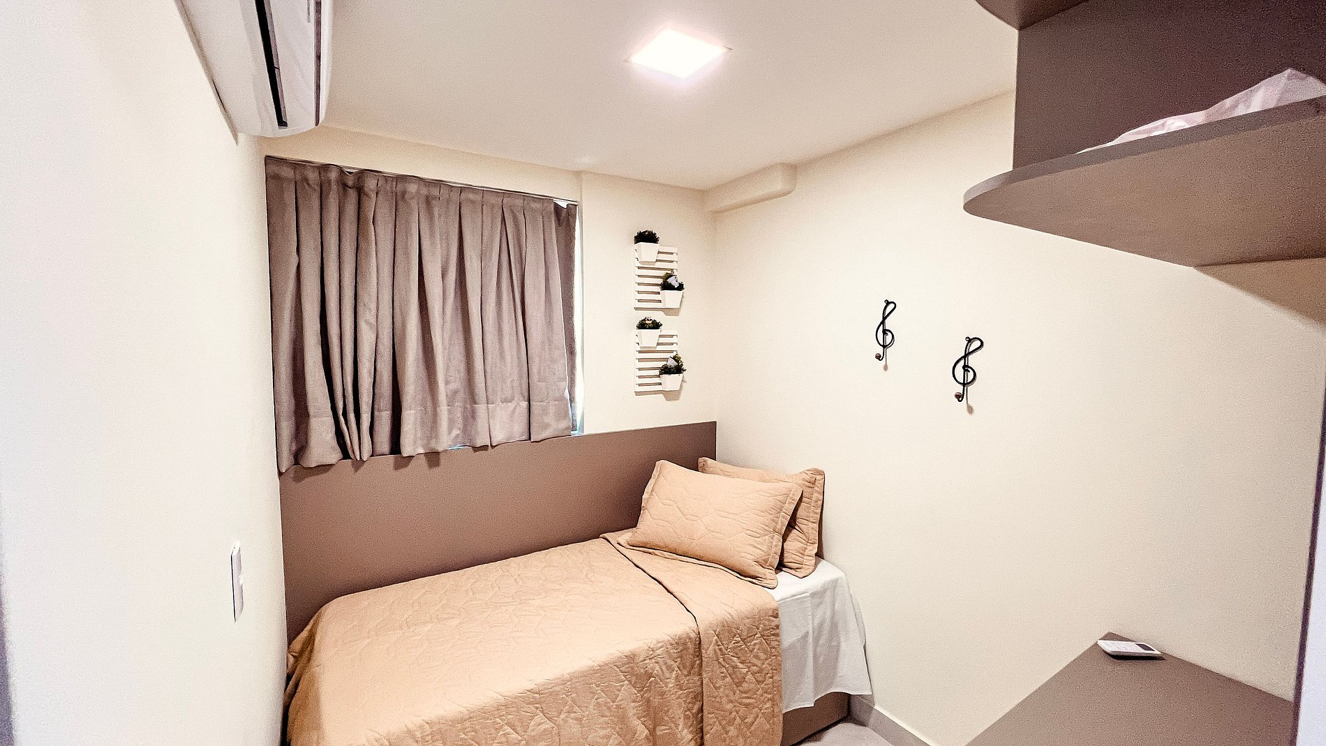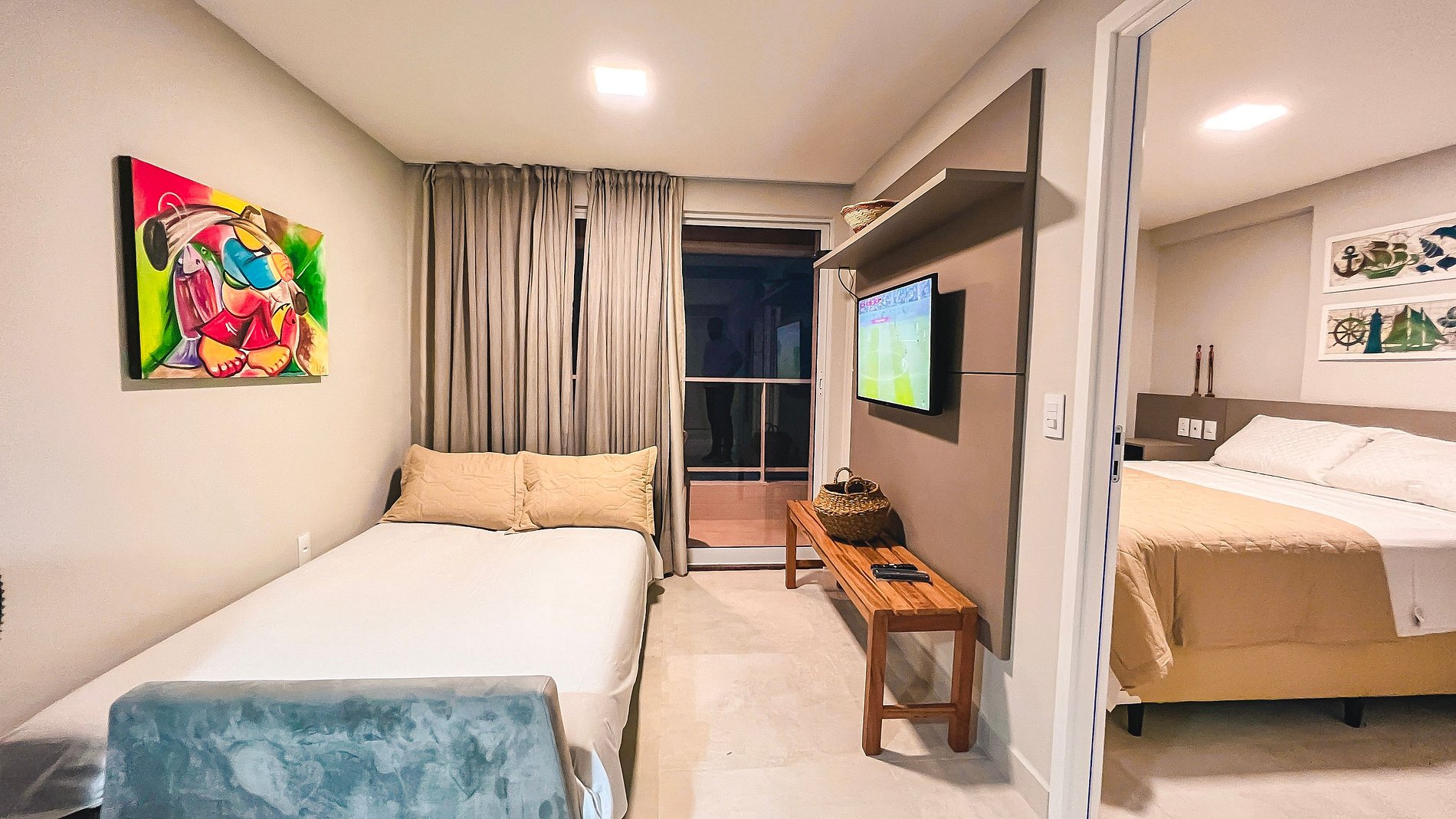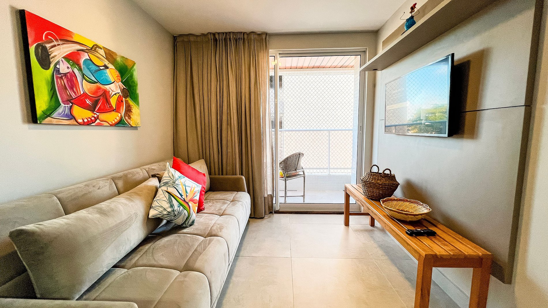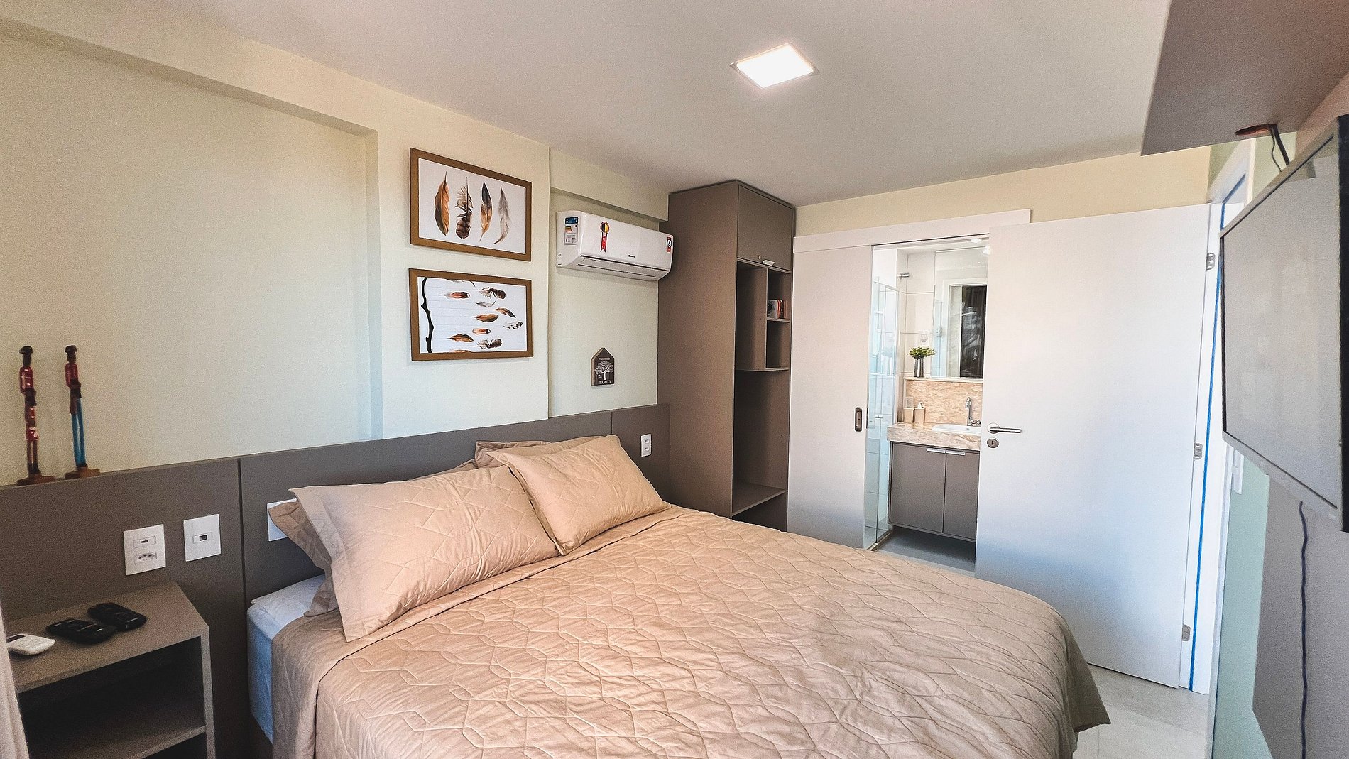 Apartamento no Cabo Branco com 2 quartos (1 suíte), 2 banheiros e varanda. Quartos climatizados, sala integrada com Smart TV, cozinha completa equipada e condomínio com piscina na cobertura, academia, cinema, jogos, minimercado, lavanderia, vaga de garagem e recepção 24h.