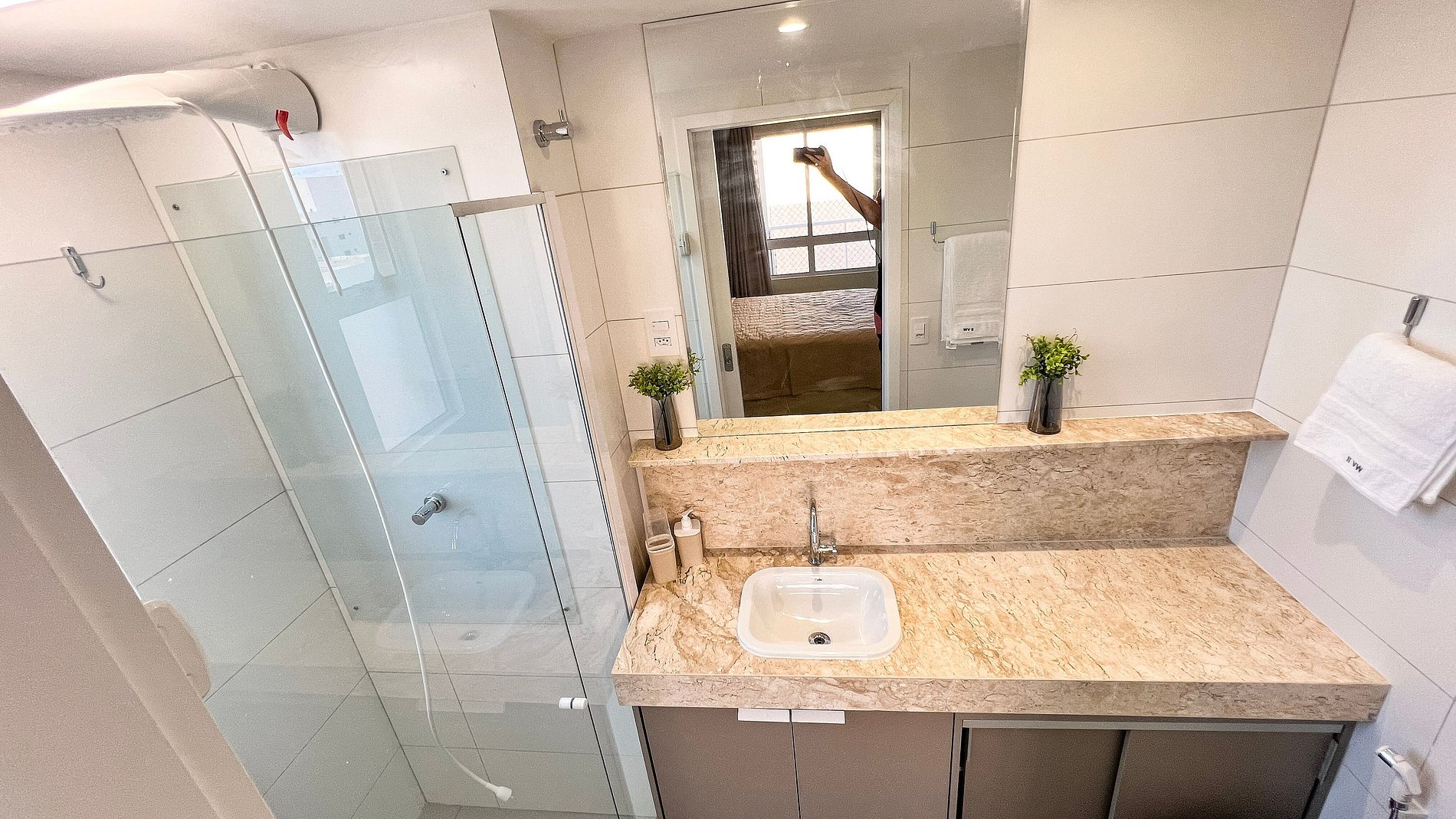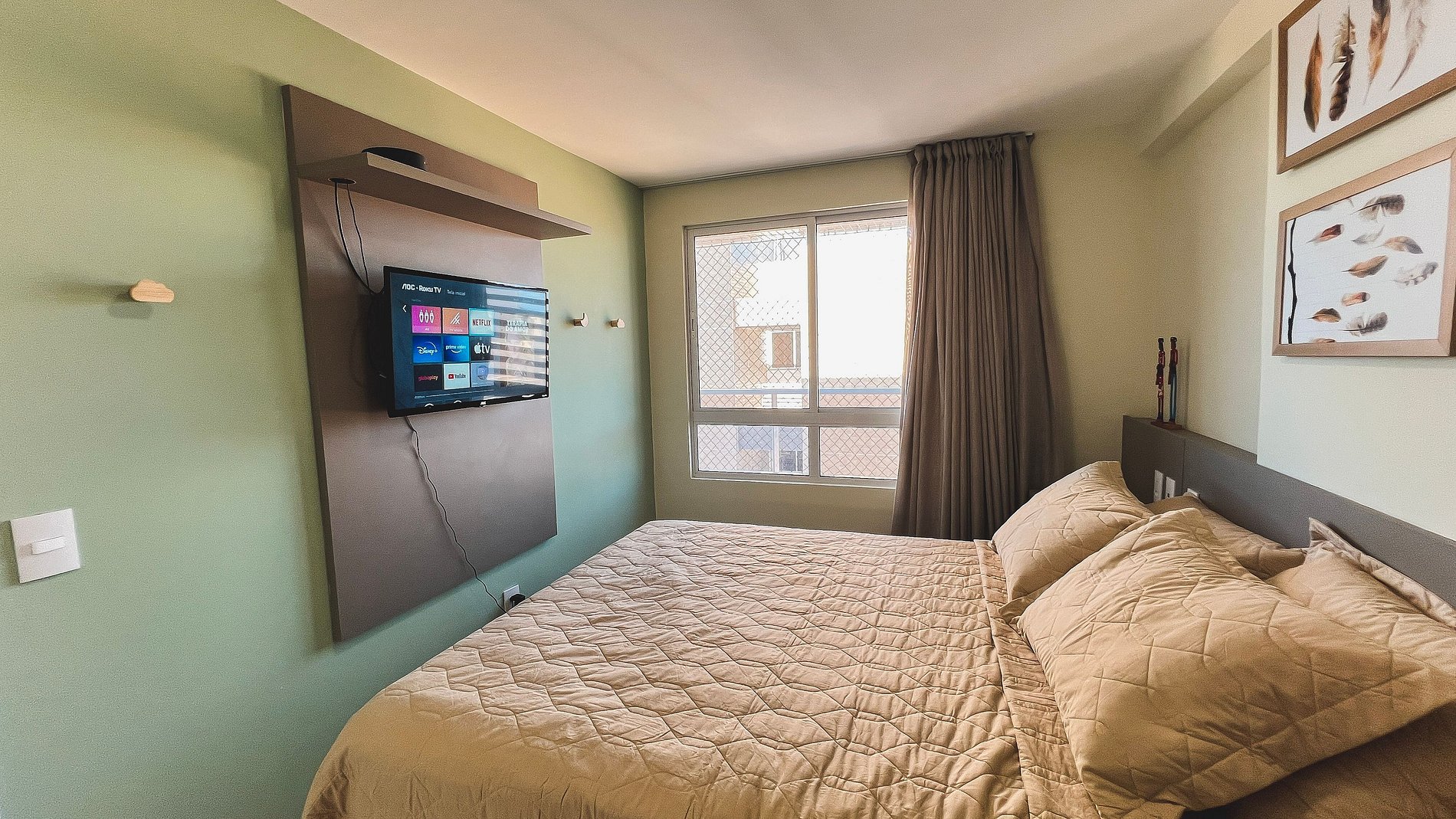 - 2 quartos (sendo 1 suíte), ambos com ar-condicionado; um deles com TV.