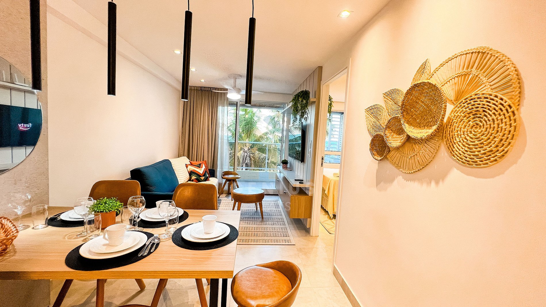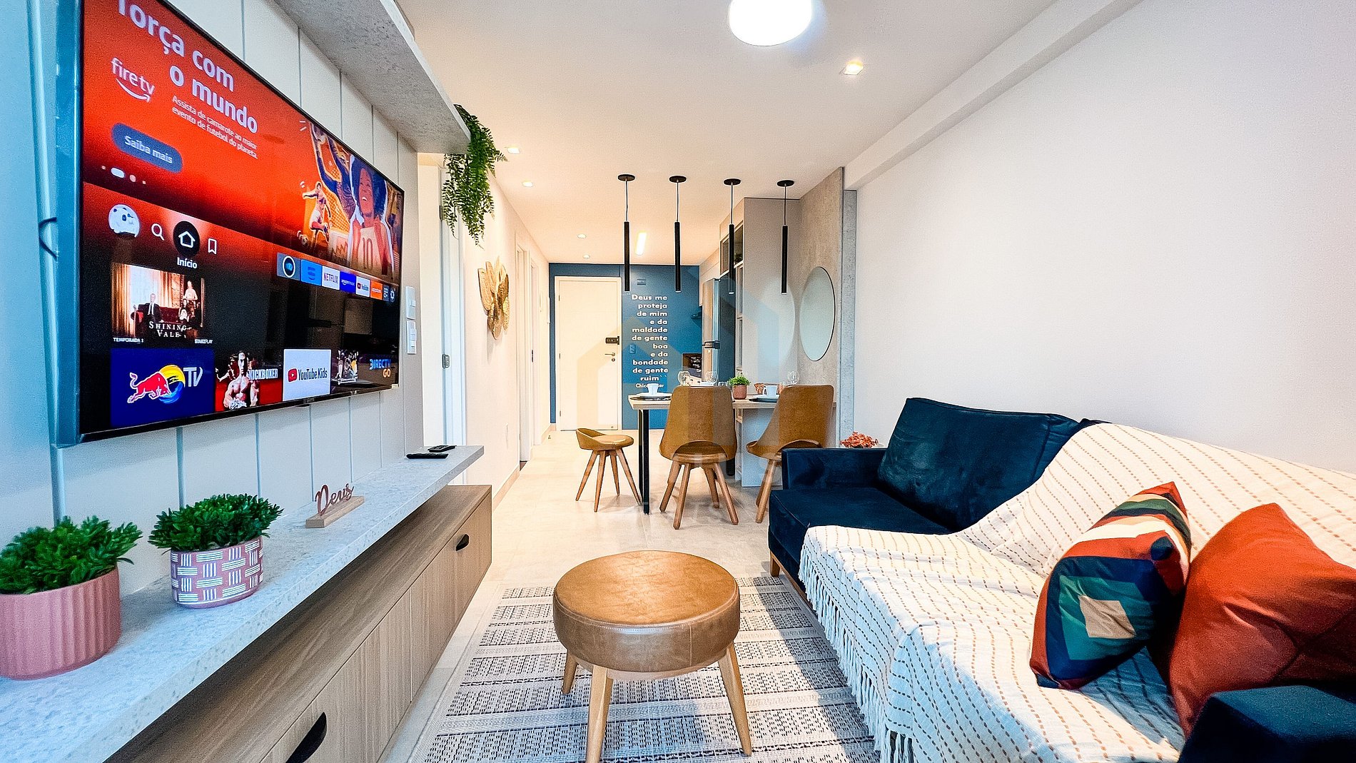 - Sala de estar e jantar integradas com sofá-cama, Smart TV e ventilador.