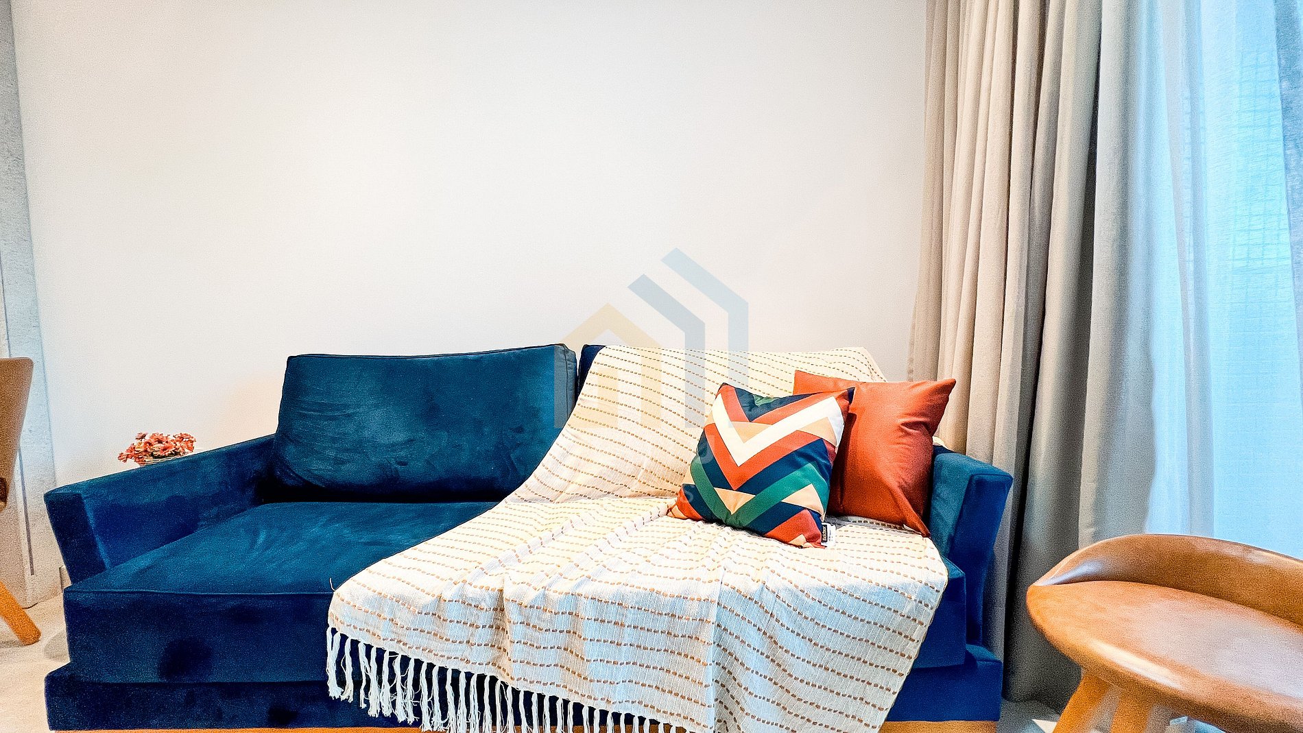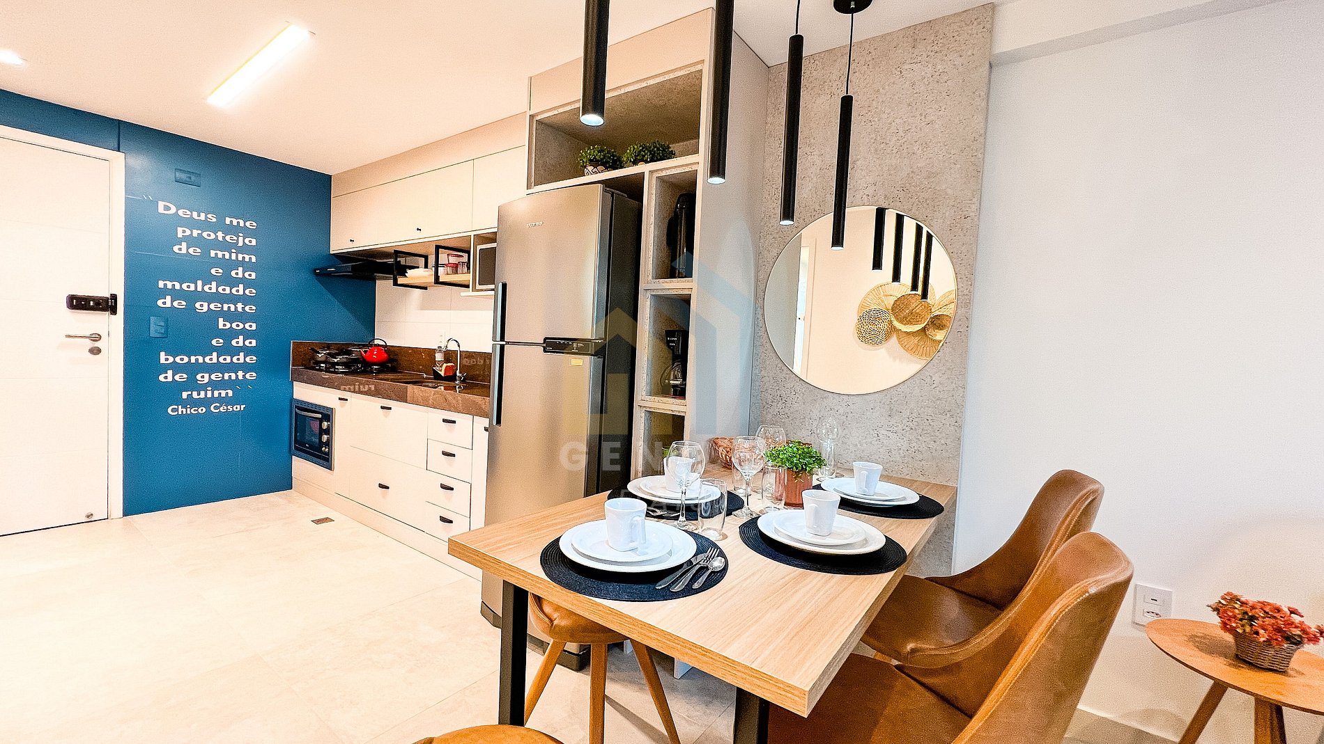 - Sala de estar e jantar integradas com sofá-cama, Smart TV e ventilador.