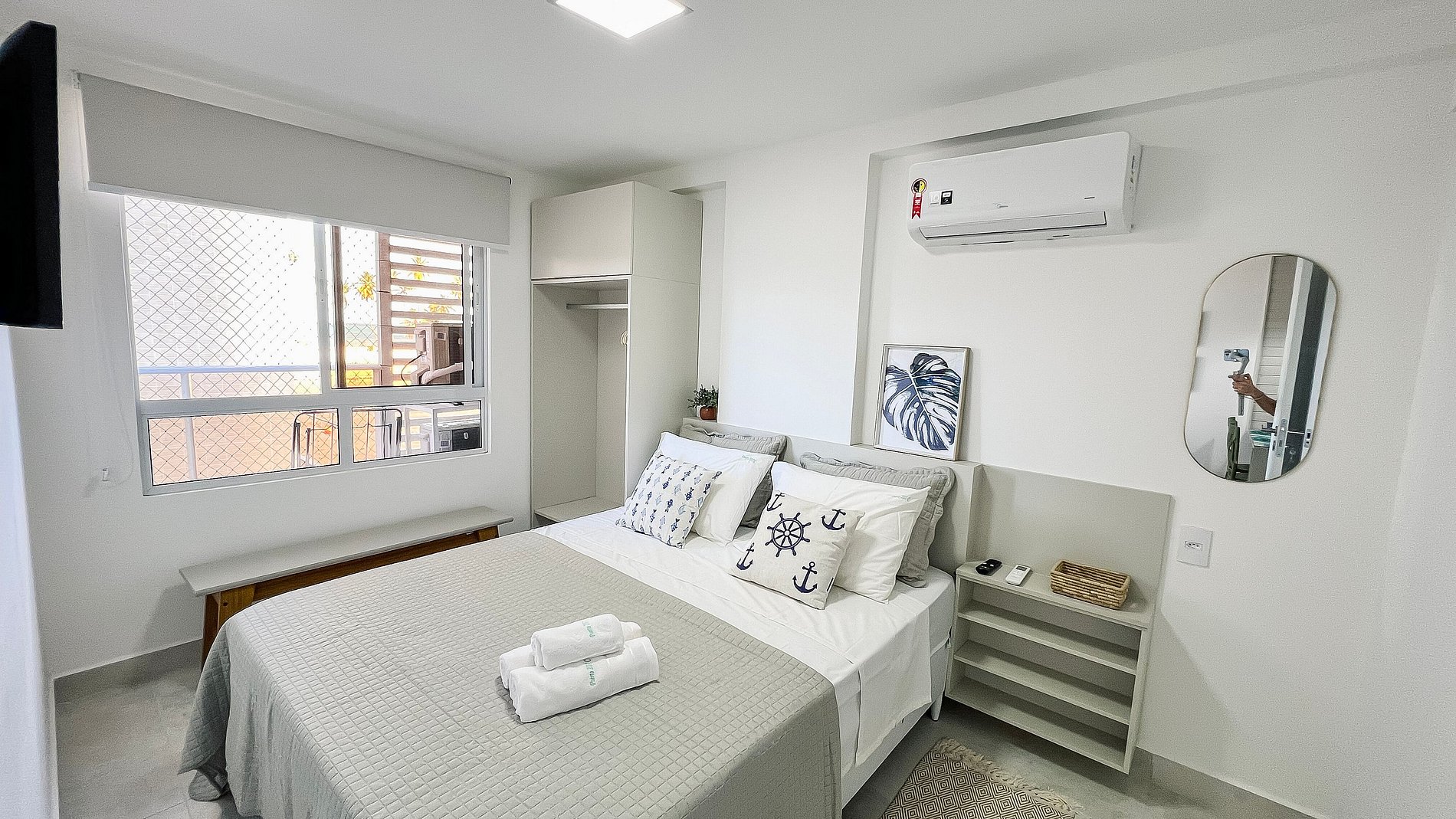 Apartamento no Cabo Branco com 2 quartos (1 suíte), 2 banheiros e varanda. Quartos climatizados, sala integrada com Smart TV, cozinha completa equipada e condomínio com piscina na cobertura, academia, cinema, jogos, minimercado, lavanderia, vaga de garagem e recepção 24h.