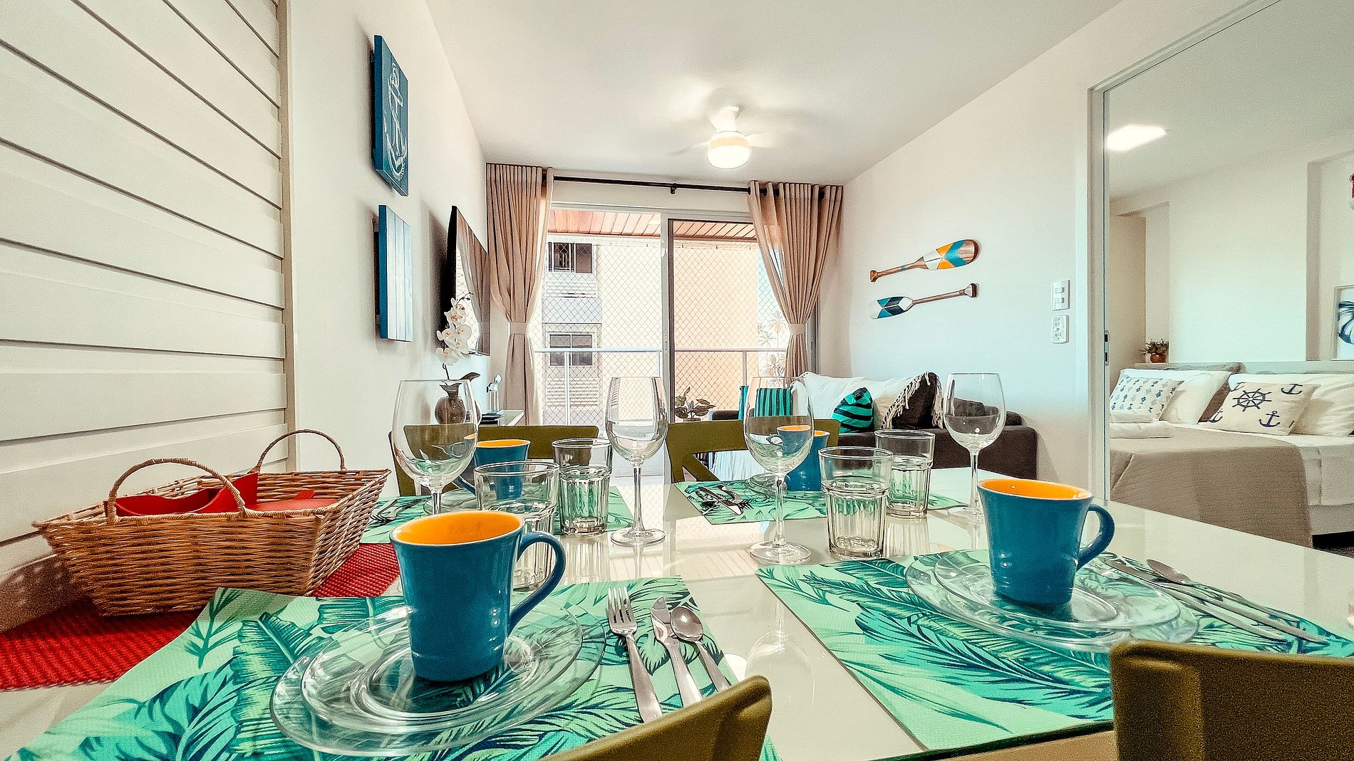 - Sala de estar e jantar integradas com sofá-cama, Smart TV e ventilador.