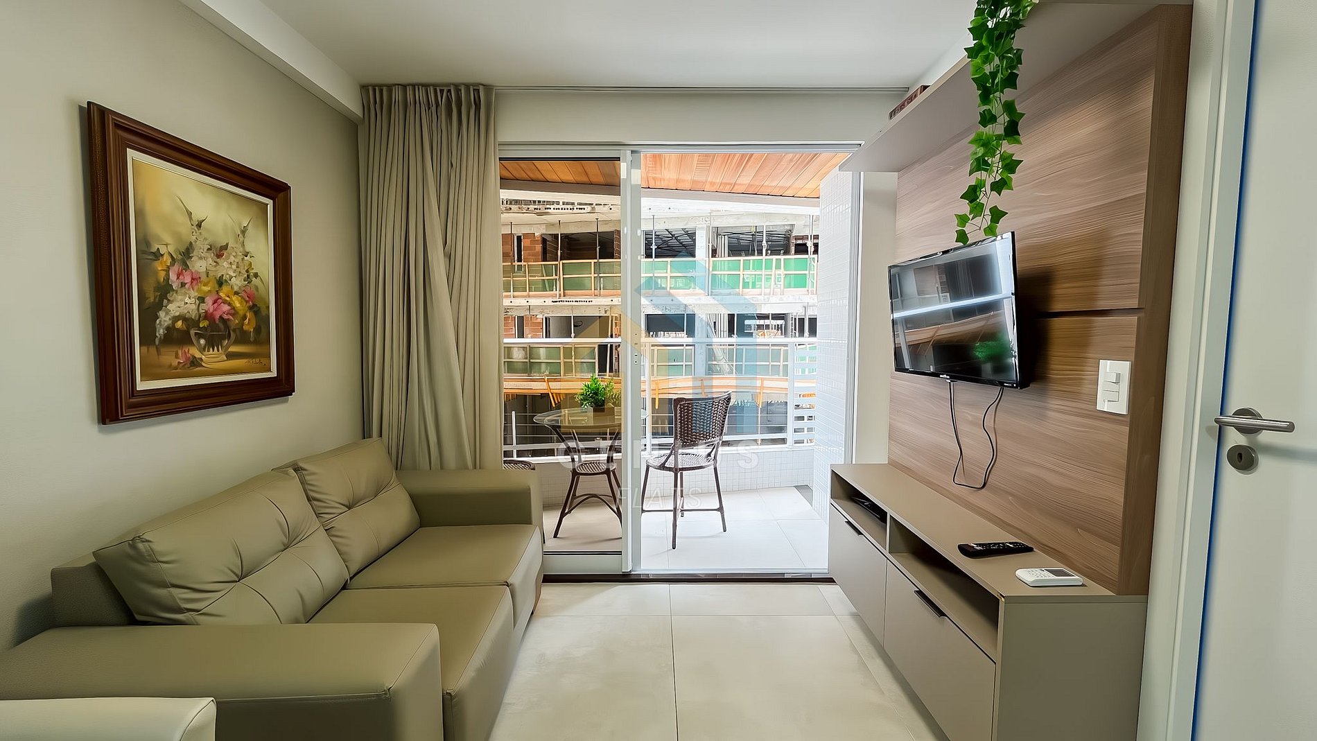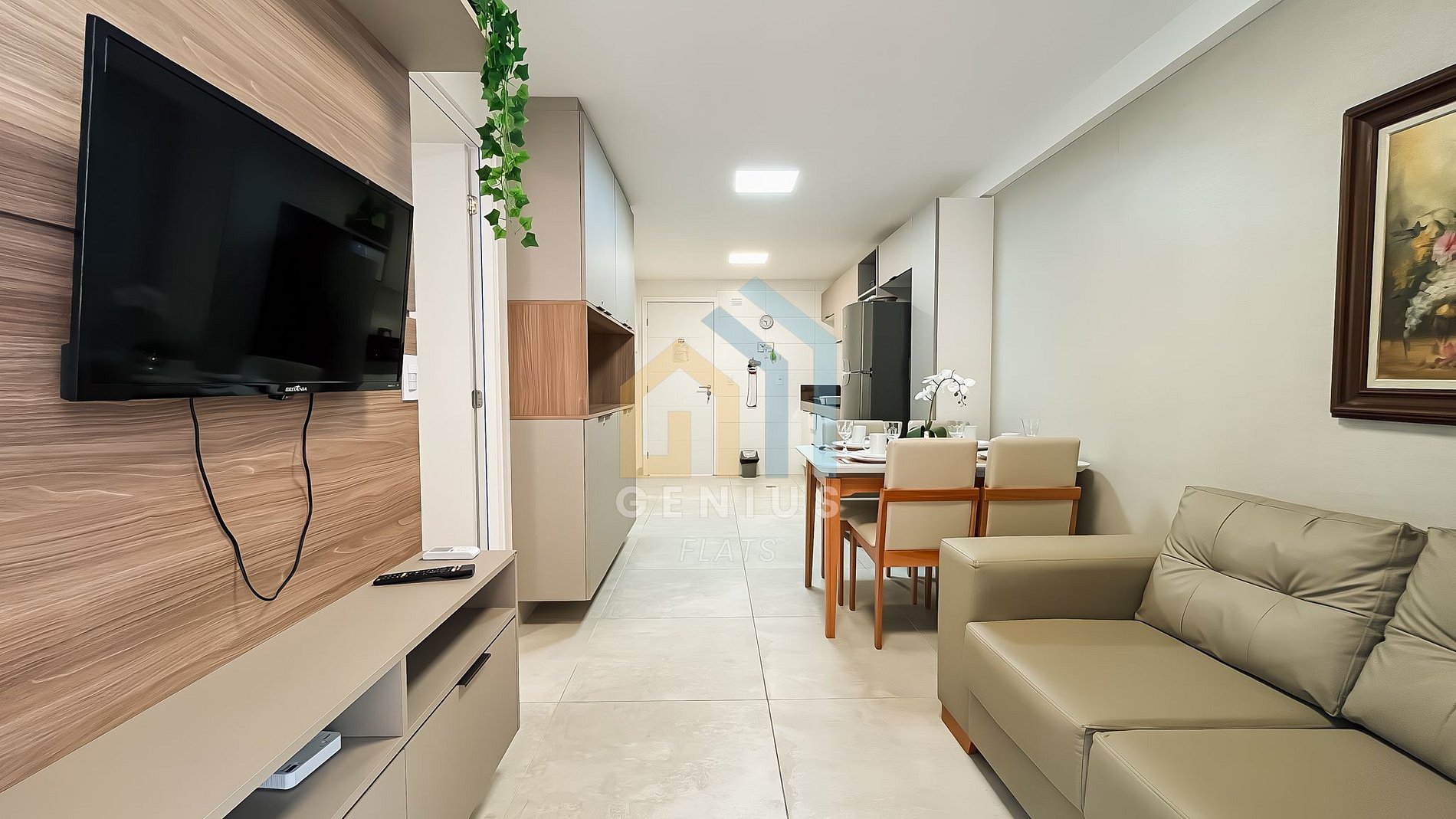 - Sala de estar e jantar integradas com sofá, Smart TV e ventilador.