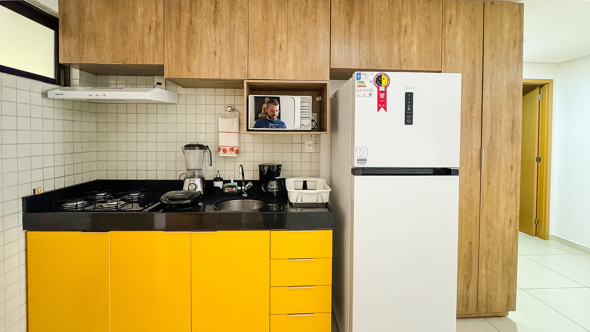- Mini Cozinha para Refeições Rápidas com Geladeira, Cooktop 4 bocas, Microondas, Liquidificador, Sanduicheira, Pratos, Copos, Xícaras, Talheres, Panelas (Básico).