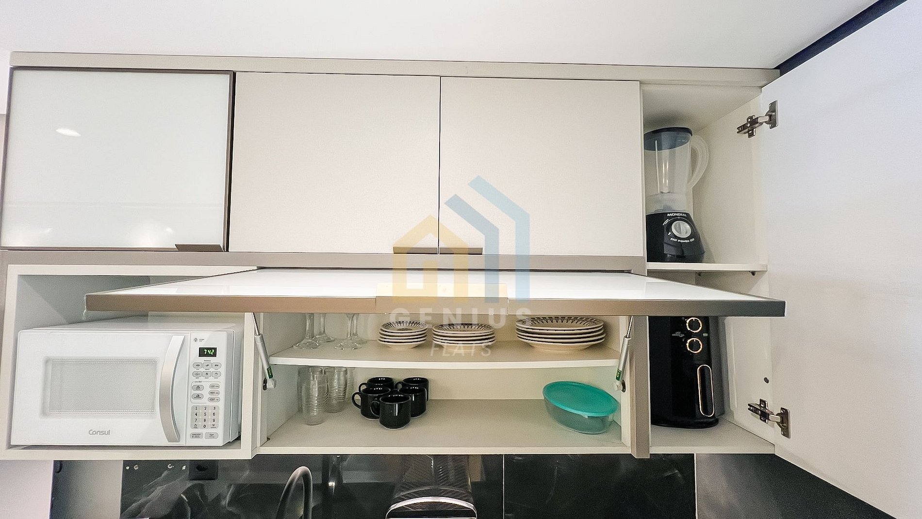 - Mini Cozinha para Refeições Rápidas com Geladeira, Cooktop 4 bocas, Microondas, Liquidificador, Sanduicheira, Pratos, Copos, Xícaras, Talheres, Panelas (Básico).