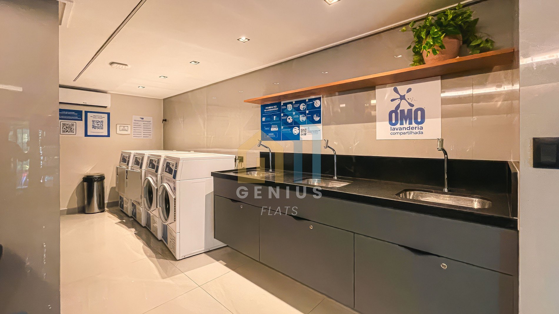 Lavanderia paga – Máquinas disponíveis no edifício (pagamento via aplicativo/direto no local).